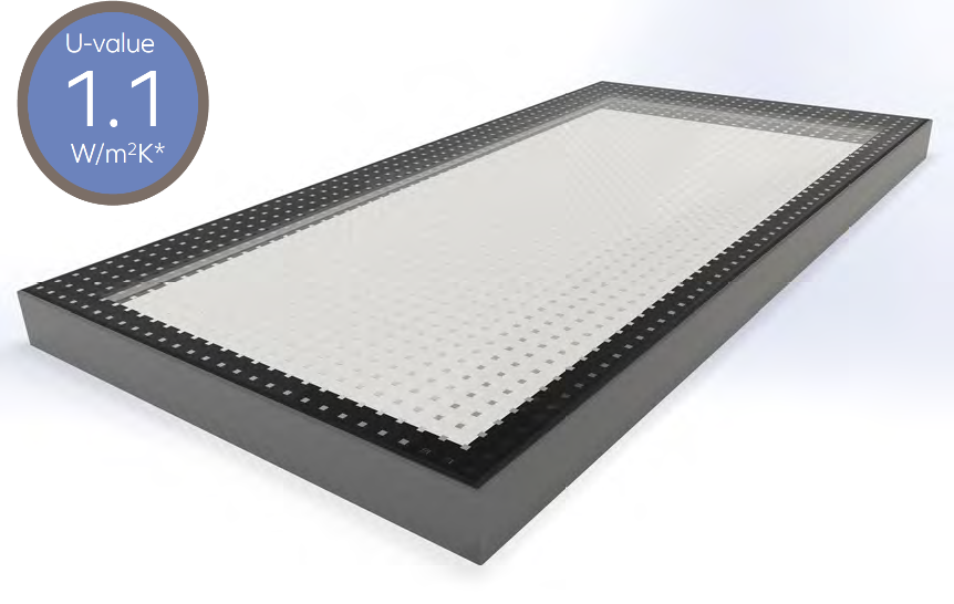 • For stock sizes of Walk-on Flatglass rooflights, our standard glass specification is as follows: 33mm clear glass heat soak tested toughened laminated outer pane; 16mm argon filled (90%) cavity plus warm edge spacer; 6mm clear glass Low-E heat soak tested toughened inner pane, all UV resistant silicone bonded, designed to accommodate domestic loadings.