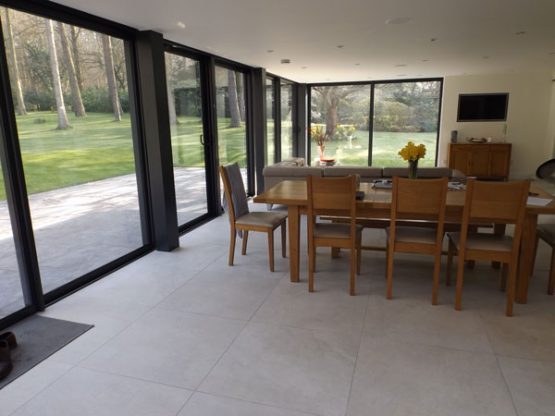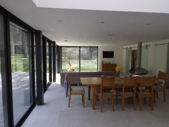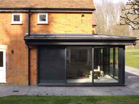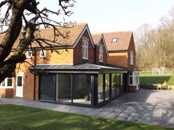 This two double storey rear extensions to an 1850s and 1930s wing, are visually separated by two linear rooflights that together create a light filled primary axis. And the glazed walkway bridges the double height slot. A modern aesthetic of dark grey aluminium was fused with traditional forms to create a series of intimate cellular spaces that open out into the axis and the modern open plan garden room.